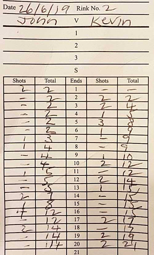 Get hold of the jack and stage a rally. Medium length ends seem to be doing the trick. As we start the sixteenth I comment it's a good time for a four bowl win. Bingo! Four to me and 12-15. Swap a couple of ends. It's 14-17. A good win could see me draw level. Not to be. Kevin takes the next two ends and a 14-21 win.