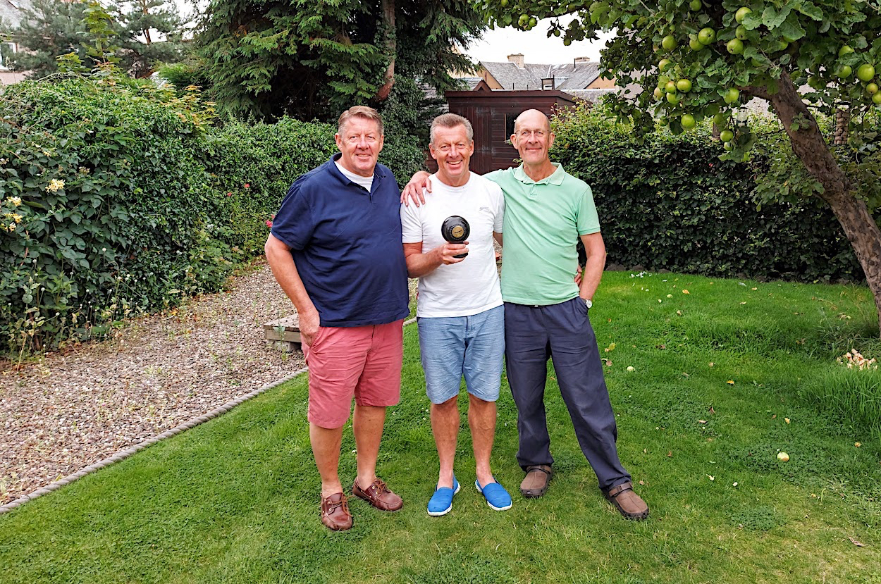 Congratulations to Andrew, who keeps the trophy. The following day we have the awards ceremony in Andrew's garden. We also decide playing three full matches in one afternoon is a bit crazy. Likely we'll have a couple of sessions on Friday and Sunday, each over twelve ends, the winning whoever has the highest aggregate score. The scorecards are shown below.